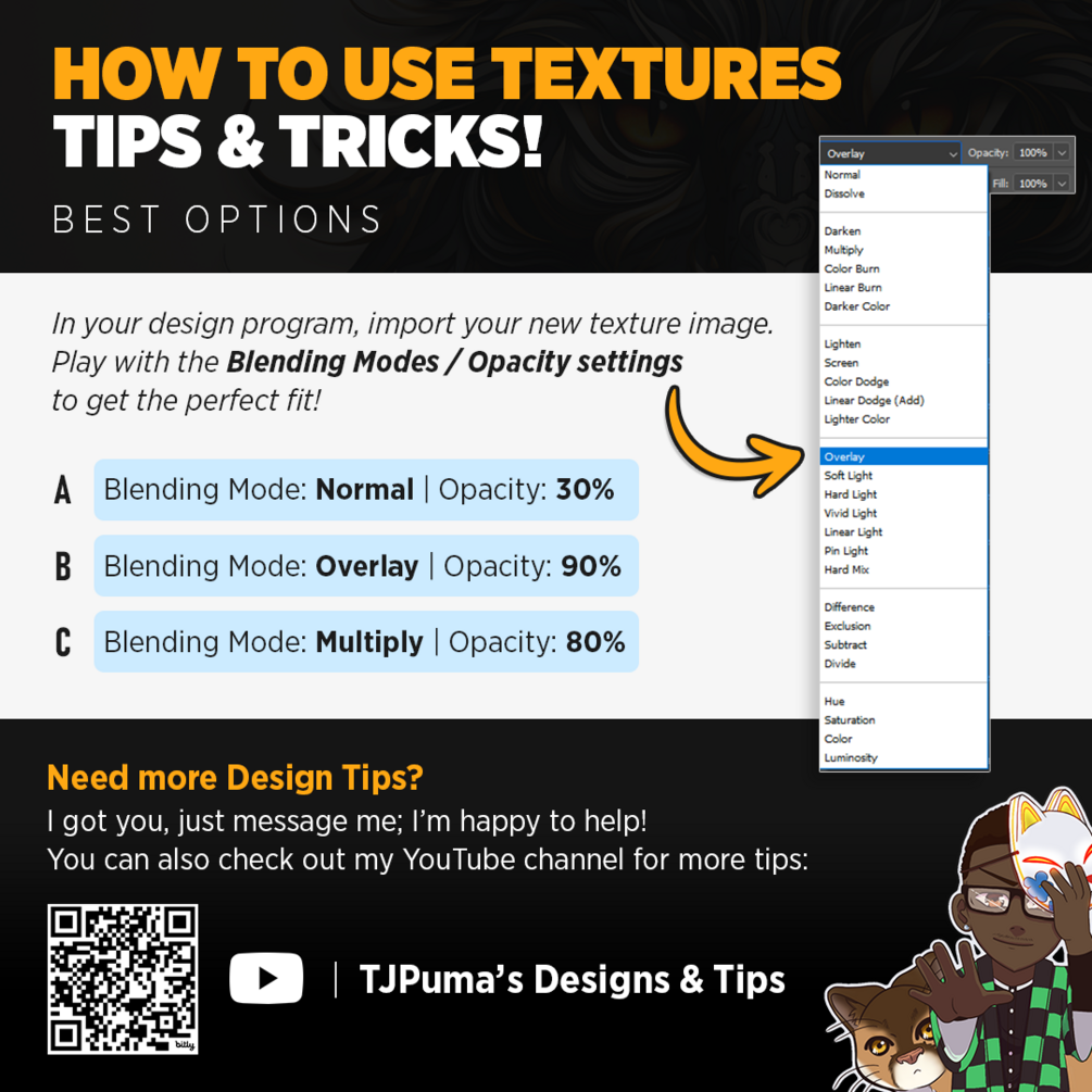 In your design program, import your new texture image. Play with the Blending Modes / Opacity settings to get the perfect fit!